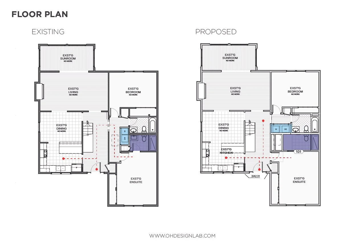 Originally envisioned to create a privacy buffer between the laundry room, sleeping quarters, and the foyer, this long, narrow hallway created a slight redundancy in the way the house was navigated. Serving as a load-bearing wall, this private-public separation effort was not to be changed. Our efforts, however, were centered on reutilizing the hallway space and reassigning values to the adjacent rooms. Moving these rooms around was like solving a puzzle.